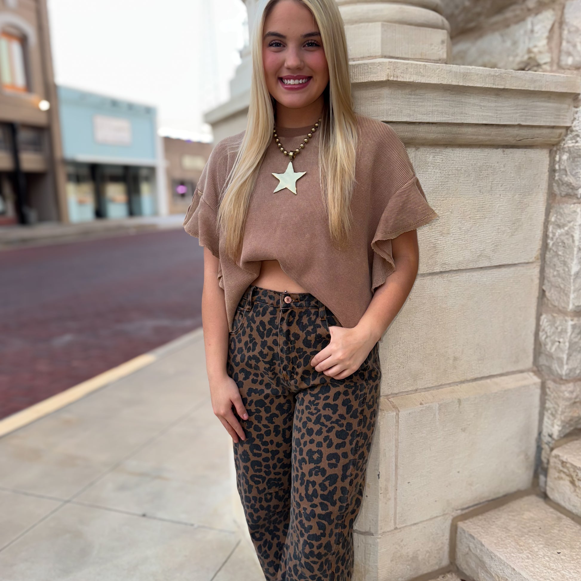 • Model is 5’3 & is wearing a size Small, cropped fit, but model has tucked for cutie style
